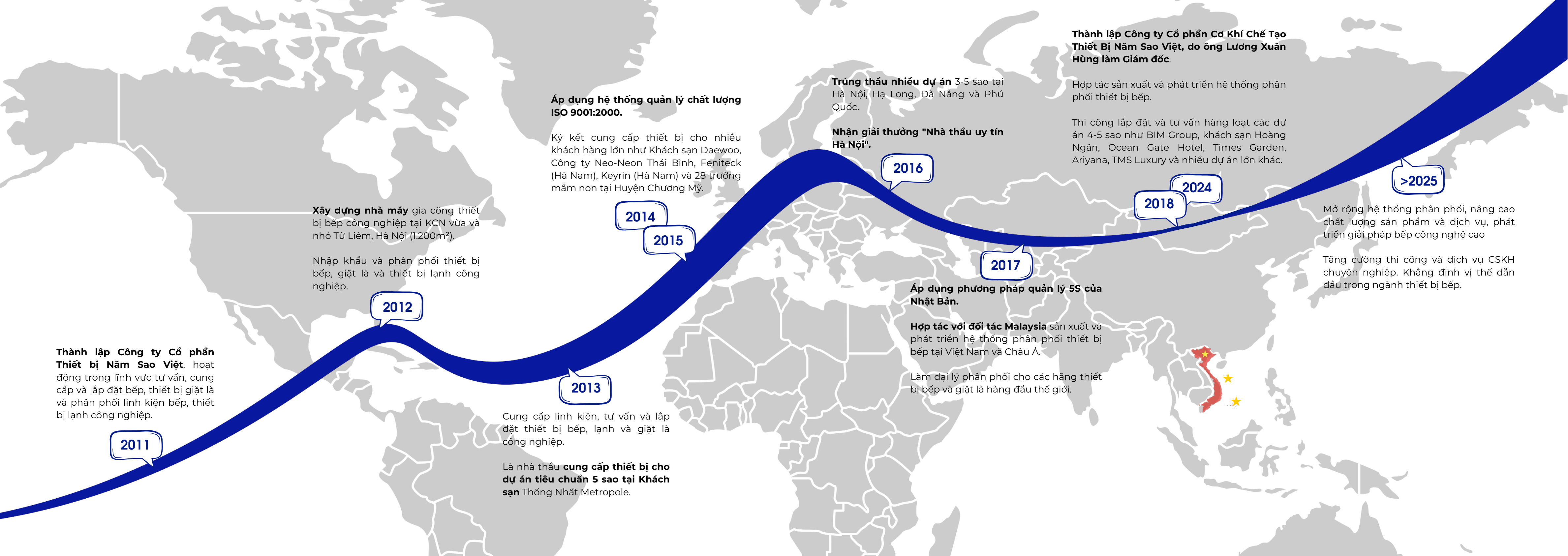 Trong quá trình phát triển, Năm Sao Việt không ngừng mở rộng quy mô, đầu tư công nghệ hiện đại và xây dựng đội ngũ kỹ sư, kỹ thuật viên lành nghề. Nhờ đó, công ty khẳng định được vị thế của mình trong lĩnh vực thiết bị bếp công nghiệp, tủ bếp inox gia đình và nghành kim loại tấm.